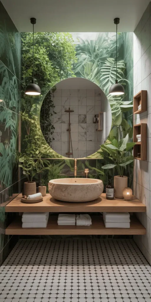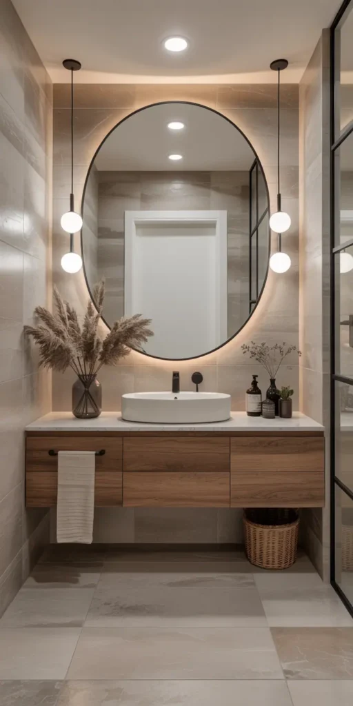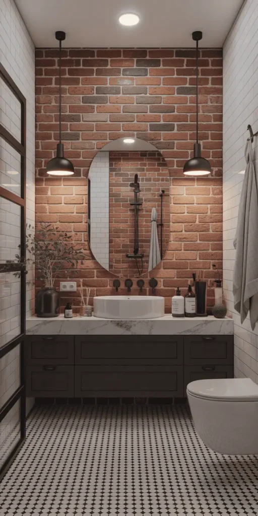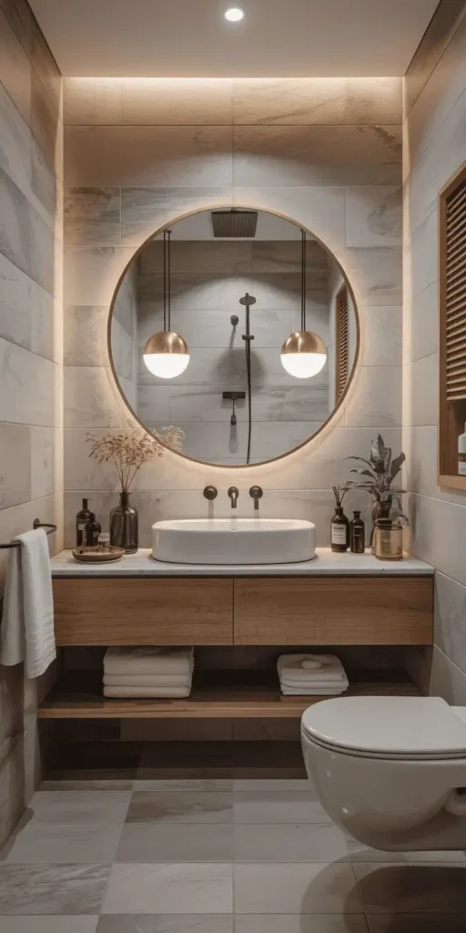 To make your bathroom warm and welcoming, choose earthy tones and natural textures. Mix materials like wood, stone, and brick for depth and interest.