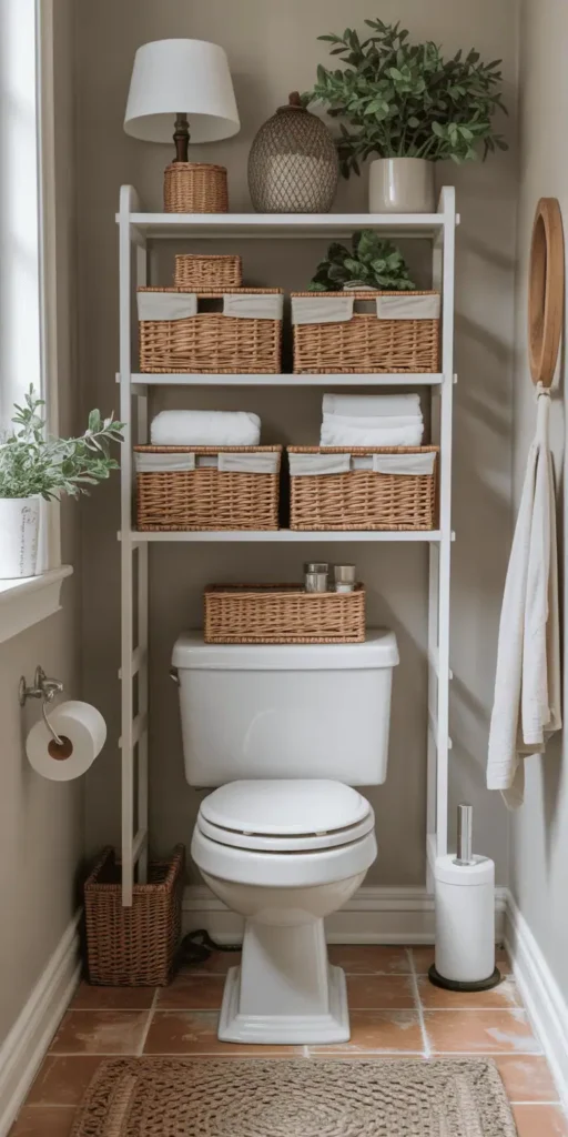 - Over-the-toilet storage units with decorative trim