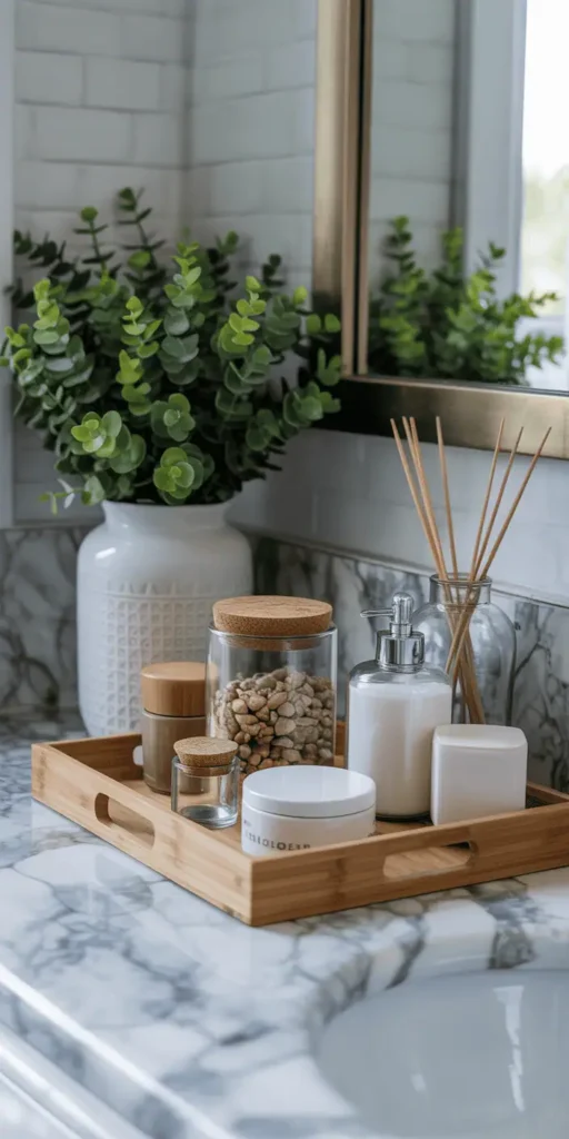 - Keep countertops clear with a decorative tray for essentials