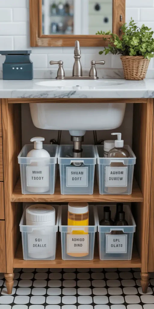 The area under the sink can be tricky to organize. Use stackable storage bins or adjustable shelving units to keep things tidy. These solutions make essentials easy to find and keep your space looking neat.