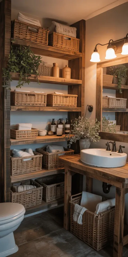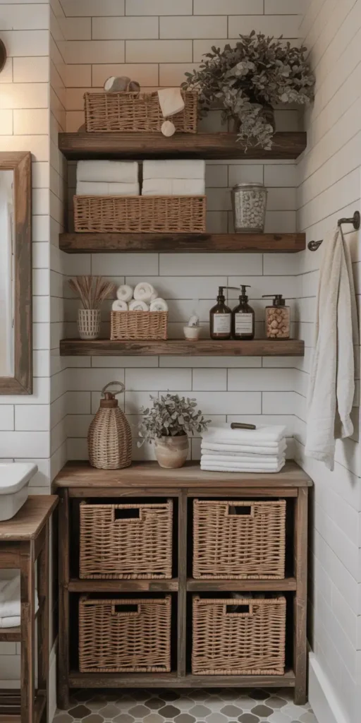 Farmhouse and rustic bathrooms are cozy and warm. Use reclaimed wood shelving and woven baskets to add character and storage. These elements make your bathroom feel welcoming and homey.