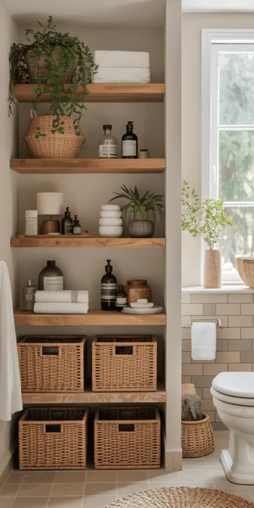 Storage baskets and bins are great for organizing bathroom essentials. Wicker baskets are perfect for towels and toiletries, adding warmth. Place them under the sink, on shelves, or on the counter.