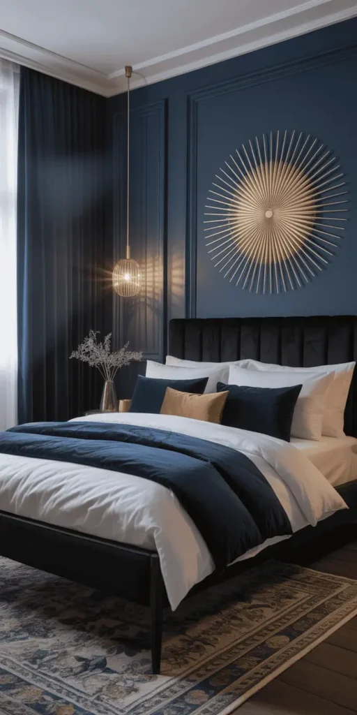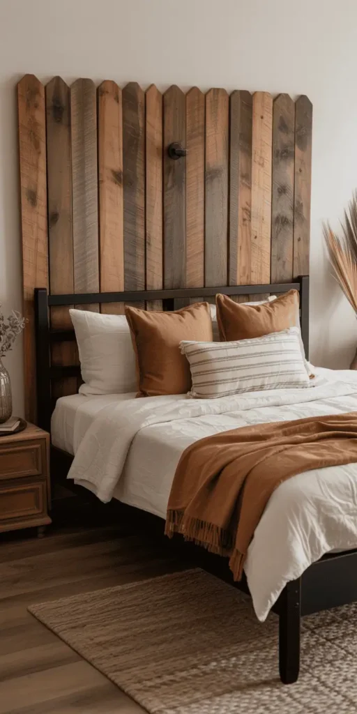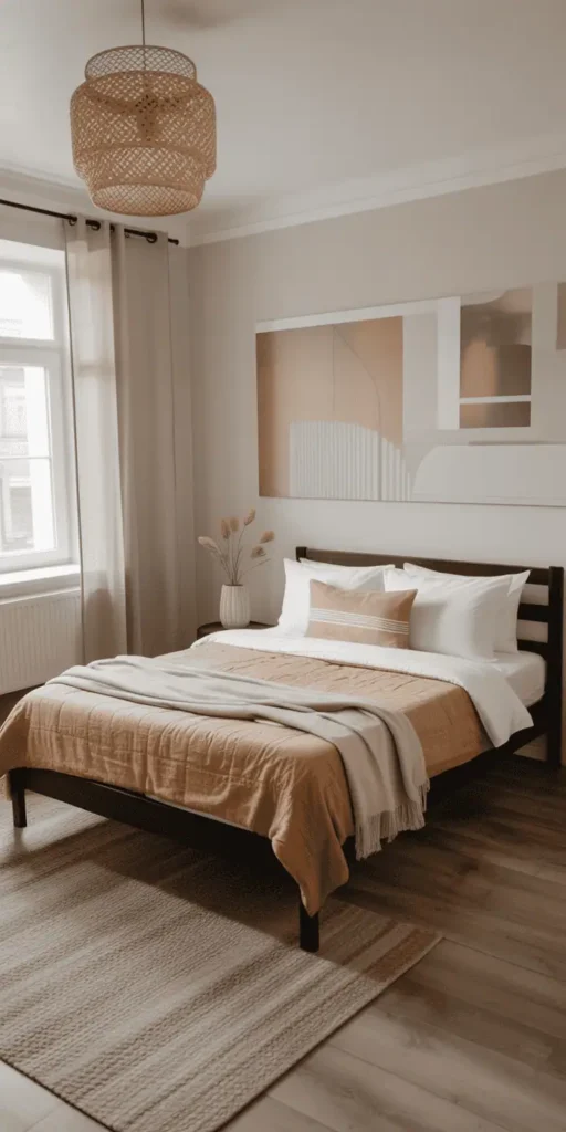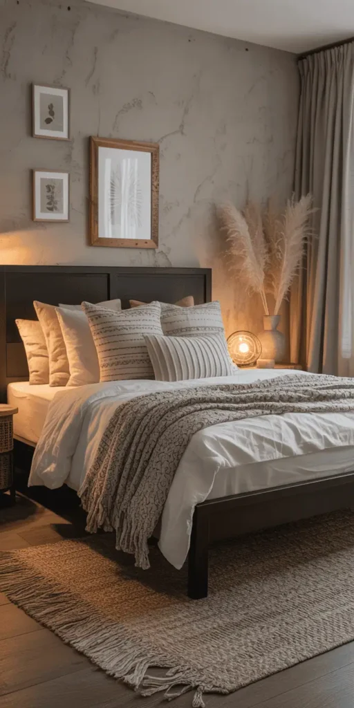 “Let one standout item anchor the space,” says interior experts. A geometric rug or textured ceramic vase can draw the eye without clashing with the bed frame.