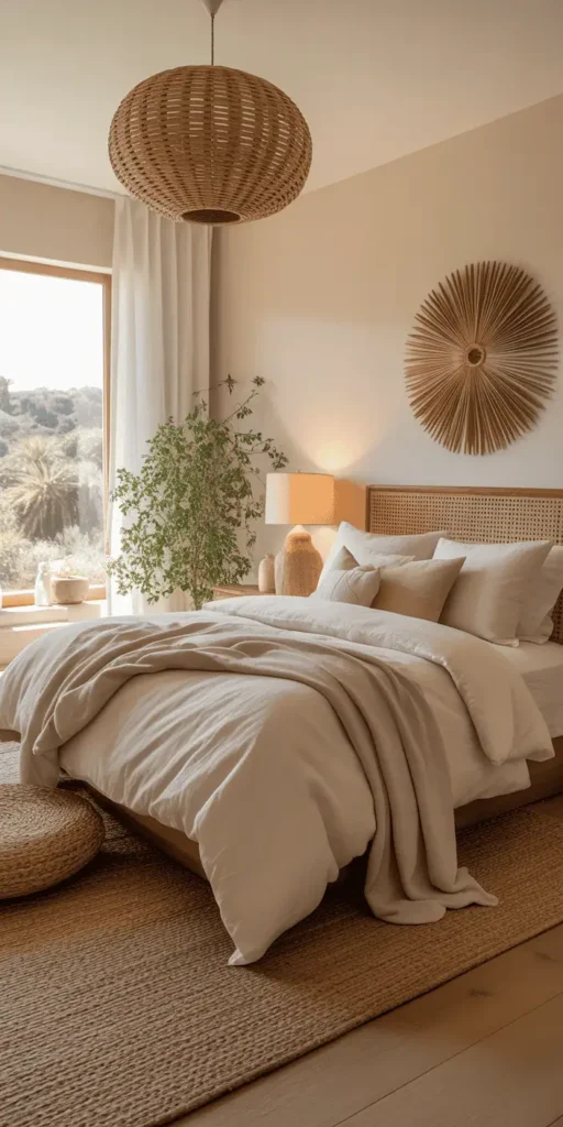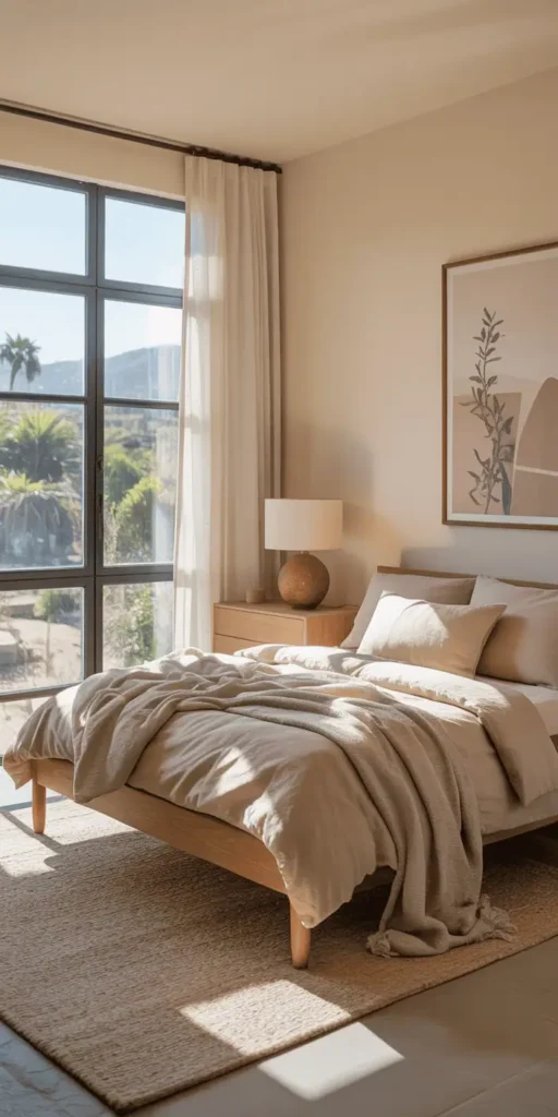 This design uses light wood, soft textiles, and natural elements. It creates a space that feels soothing and stylish.