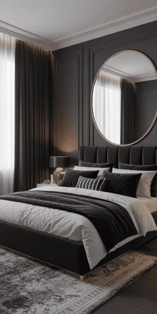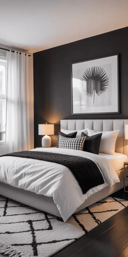 Whether it’s historical styles or modern stars, the black and white color scheme is always in style. It’s a great base for stylish bedroom decor. Even small changes, like a black accent wall, can make a big difference.