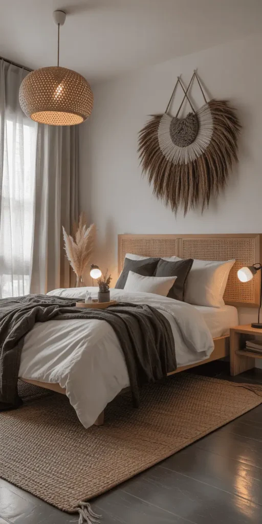 - Add woven rattan baskets or textured wall art to add visual interest.