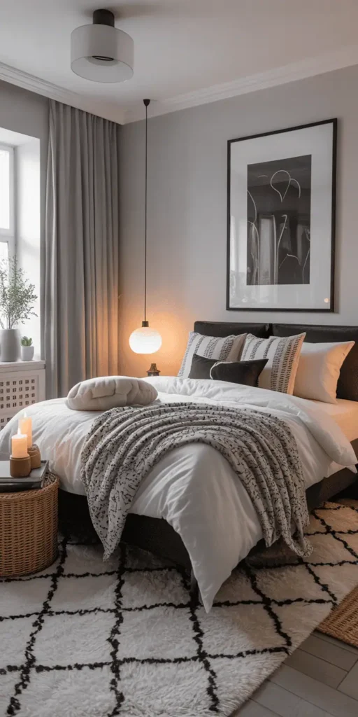 Track lighting can highlight art or textures. Smart systems like Philips Hue let you set scenes. A black and white home decor bedroom becomes more interesting when lighting brings out contrasts and textures.