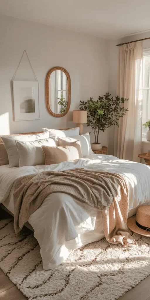 Texture is key in making a bedroom cozy and welcoming, perfect for summer. Mixing different textures adds depth and interest. It turns your bedroom into a cozy retreat.