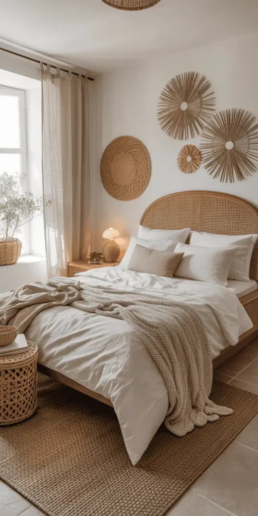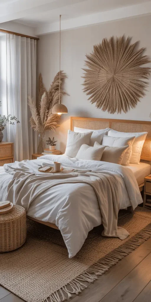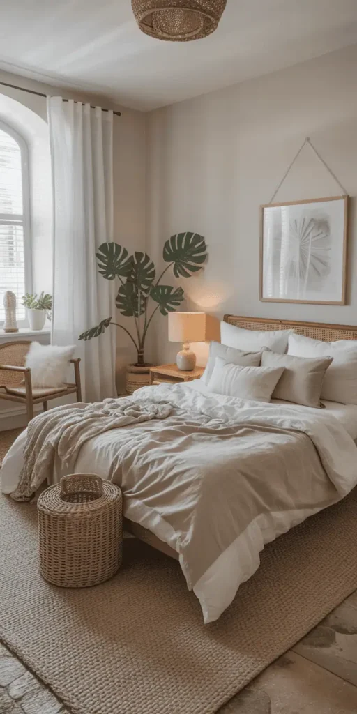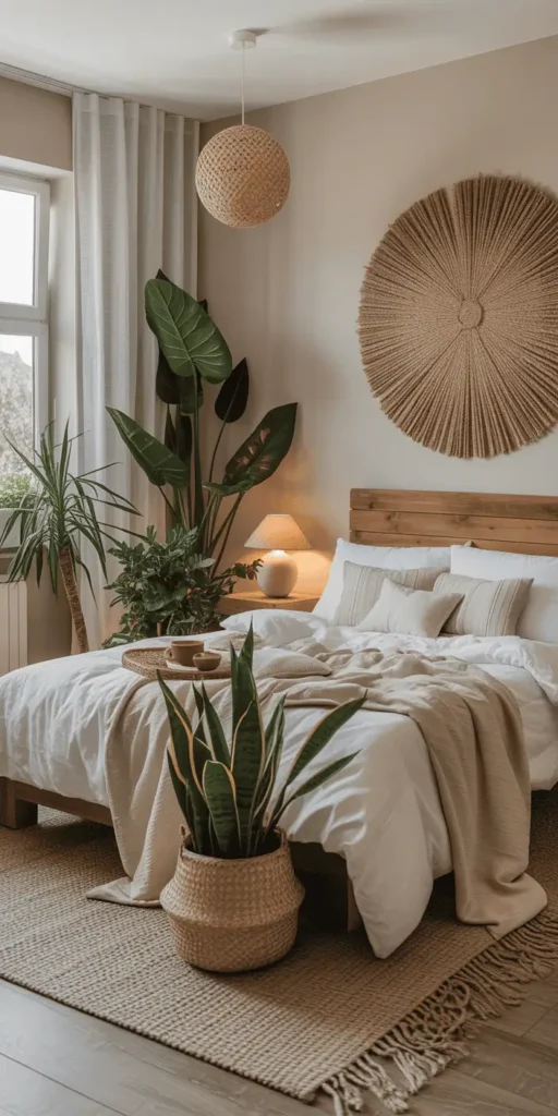 Adding natural elements to your bedroom can make it feel calm and inviting. It’s like bringing a piece of the outdoors inside. This creates a peaceful, refreshing space that feels like a tropical paradise.