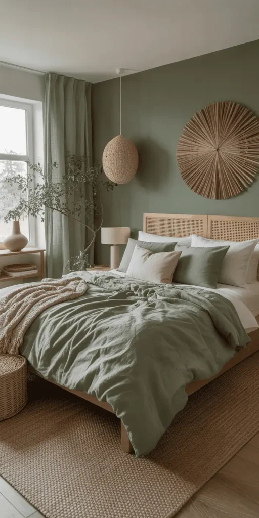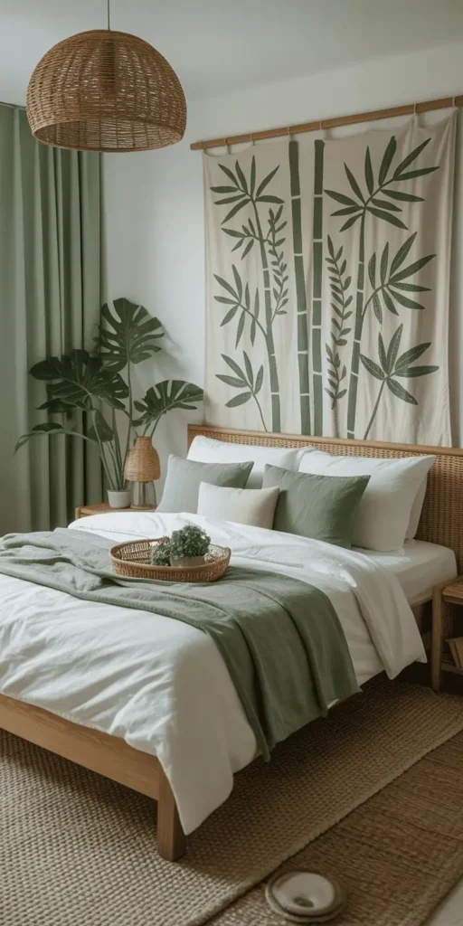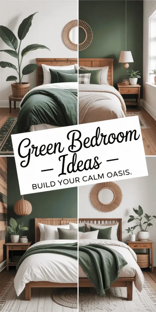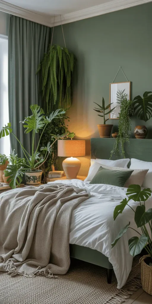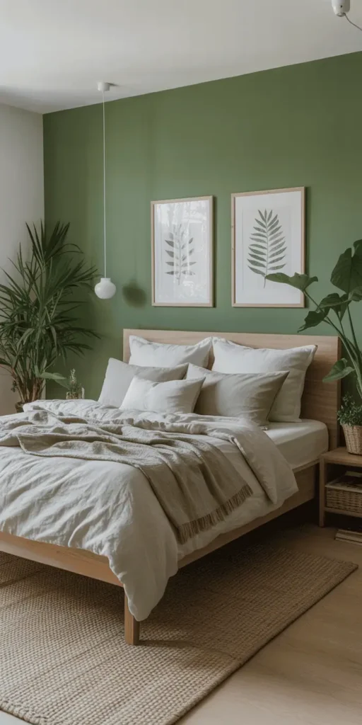 Match plants with natural items like woven baskets or ceramic pots. This ties your green bedroom decor together. Even small areas can be green with vertical planters or wall shelves.
