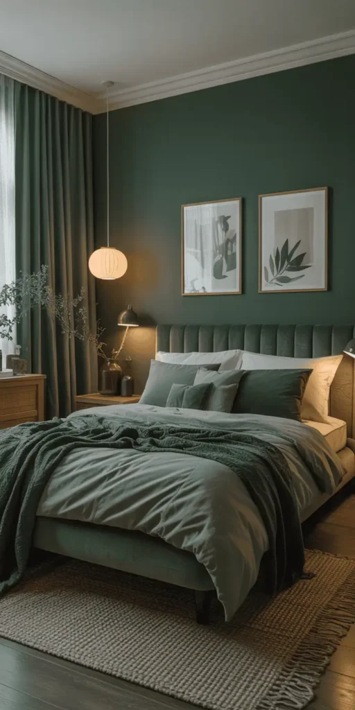 Lighting sets the mood. Choose table lamps with jade shades or pendant lights in olive tones. Brands like LUMEN offer eco-friendly LED lights that fit with green bedroom ideas. Use dimmable bulbs for a cozy feel.