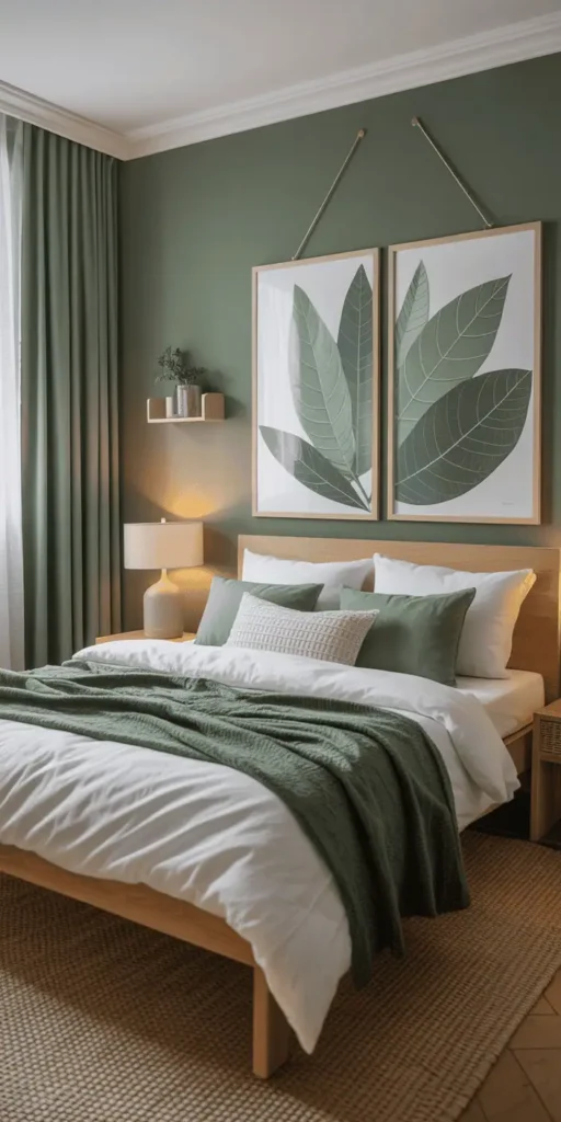 Decorate with botanical prints or abstract art in green hues. Consider framed succulent photos or geometric patterns in sage or forest shades. Add texture with woven baskets or ceramic vases to enhance depth without clutter.