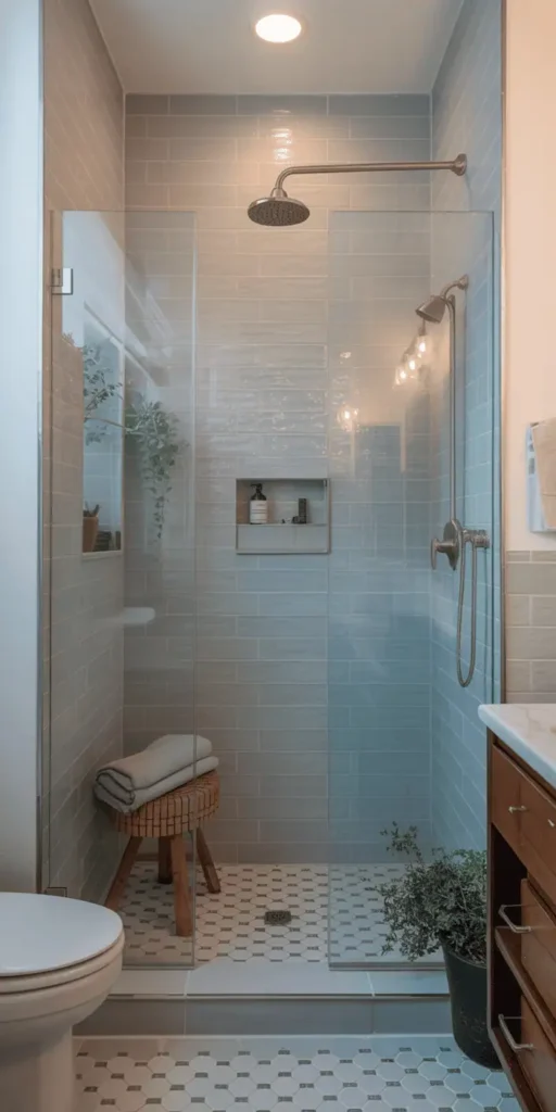 When it comes to small bathrooms, it’s essential to choose shower options that are both functional and space-efficient. Consider installing a corner shower or a walk-in shower with a curved glass enclosure to create a sense of openness. You can also opt for a shower stall with a built-in seat and niche for storage.