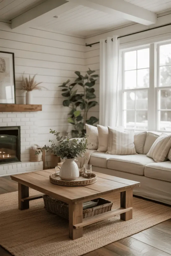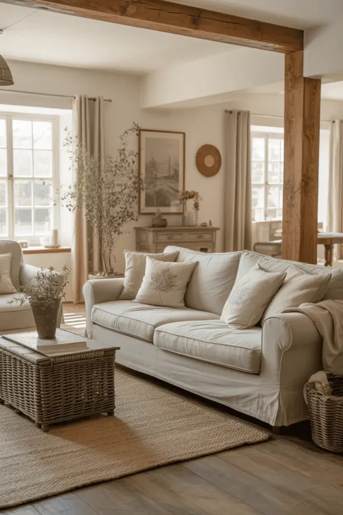 Use beige upholstery, taupe throw pillows, and natural linen curtains. These warm neutrals create a cozy, lived-in atmosphere that’s key to farmhouse living.
