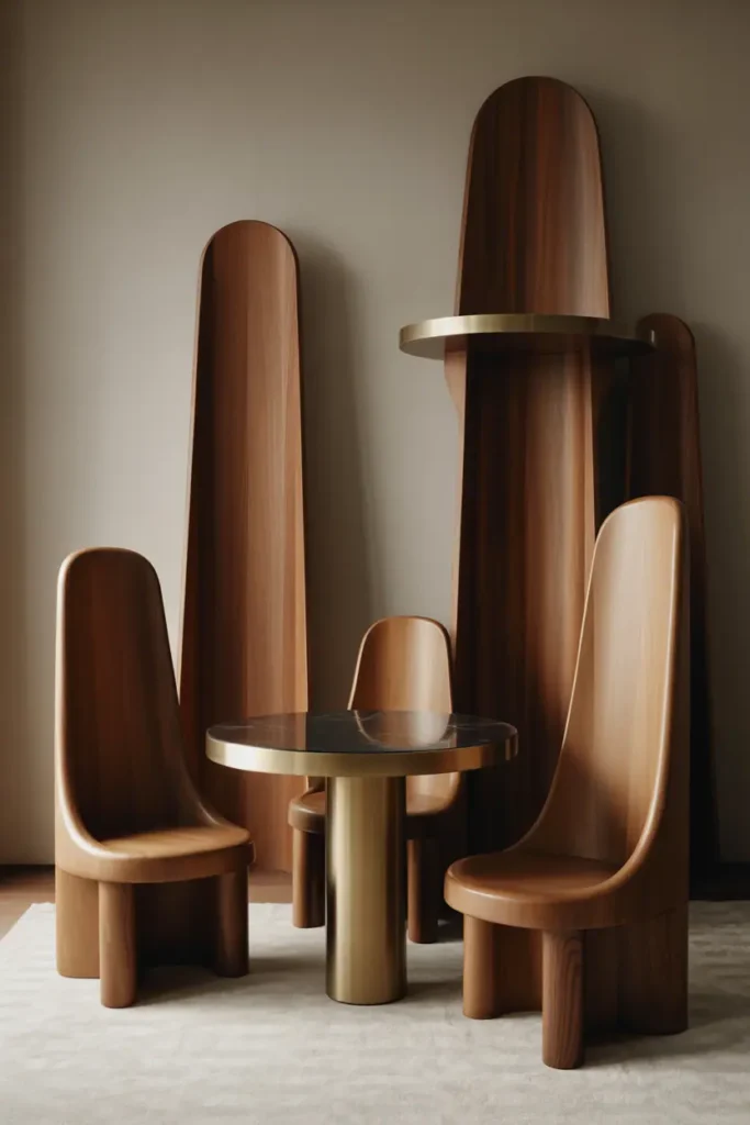 Rounded edges, curved silhouettes, fluted panels, and symmetrical forms bring back Deco elegance without heaviness. Often paired with brass, stone, or soft neutrals, wood furniture takes on a gallery-like presence.