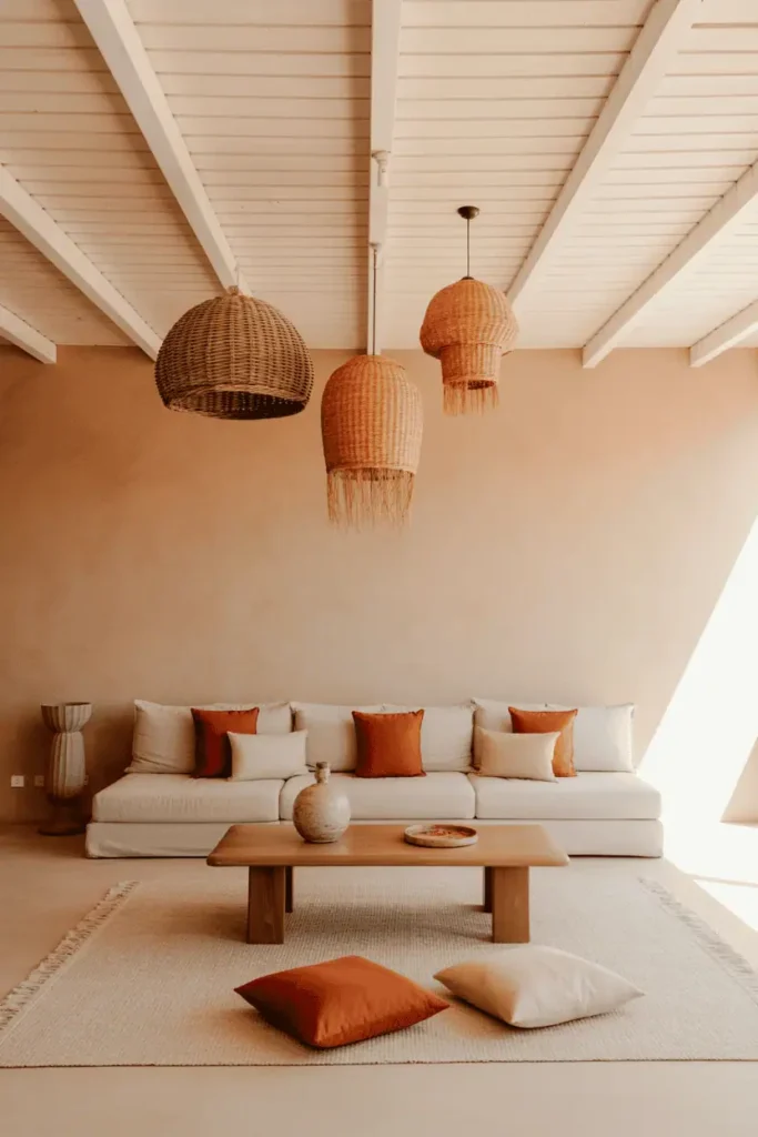 The ceiling is bleached wood — pale, almost white — with visible grain. Pendant lights made from woven palm or rattan hang at varied heights. The walls are soft terracotta. Furniture is minimal: a low sectional in natural linen, a simple wood coffee table, floor cushions in rust and cream.