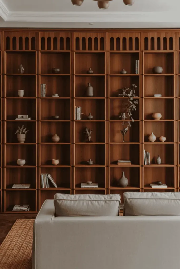 Floor-to-ceiling built-in shelving in walnut, with each section framed by a small arched opening. The shelves hold books, ceramics, and a few plants. The rest of the room is restrained: a gray linen sofa, a wool rug, simple pendant lighting.