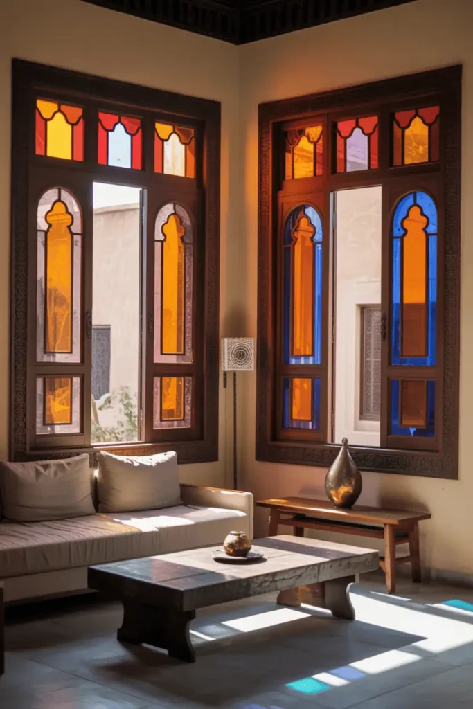 Large windows framed in dark carved wood, fitted with traditional Moroccan stained glass — amber, red, and cobalt in geometric patterns. The light filtering through is colored and shifting. Furniture is simple: a neutral sofa, a low wood coffee table, minimal accessories.