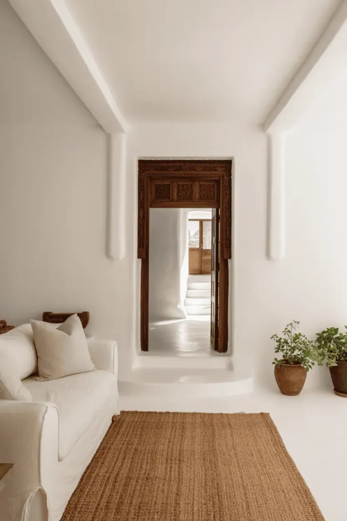 The room is almost entirely white: plaster walls, pale linen sofa, natural jute rug. The only wood detail is a single carved door frame leading to the hallway — dark walnut with traditional geometric carving. A few terracotta pots with greenery sit near the window.