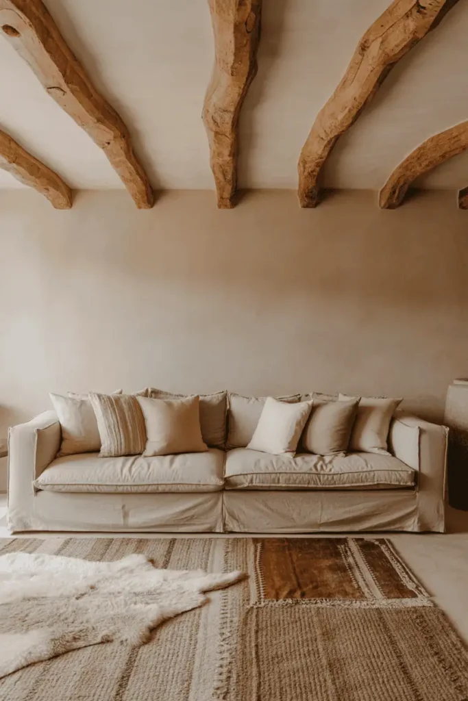 The ceiling has thick, rough-hewn beams — irregular and unfinished. Below, everything is soft: a linen sectional in natural, sheepskin throws, undyed wool rugs, cotton cushions in cream and oatmeal. The walls are smooth plaster in warm white.