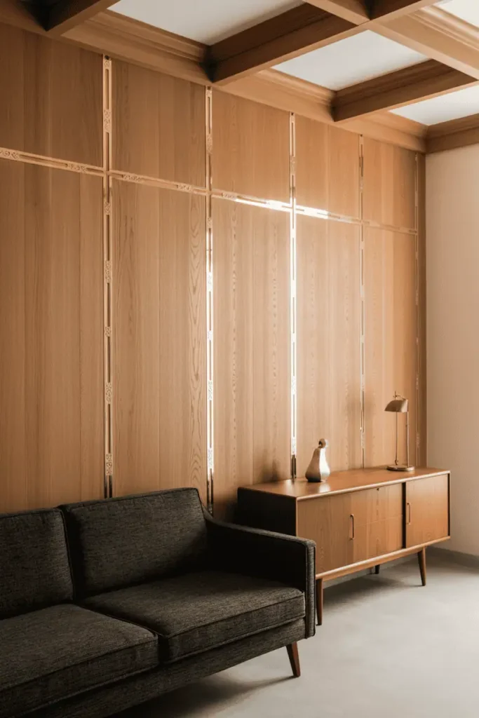 A more refined approach. The walls are covered in light oak paneling with thin brass inlay forming subtle geometric patterns. The ceiling is coffered in matching oak. Furniture is mid-century modern: a low-profile sofa in charcoal wool, a teak sideboard, minimal brass lighting.