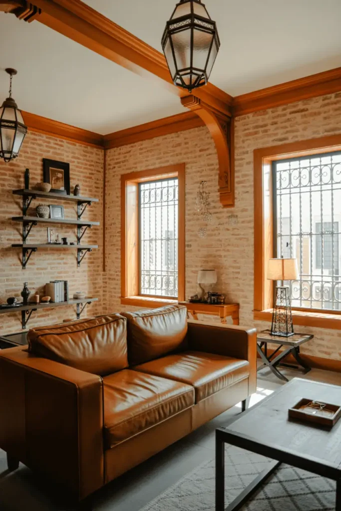 Not a typical Moroccan combination, but effective. The walls are exposed brick, and all the trim — doorframes, window frames, ceiling edges — is cedar stained warm honey. Iron brackets support floating shelves, and wrought iron lanterns hang overhead. Seating is upholstered in tobacco leather.