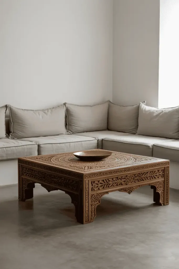 The room is kept deliberately simple so a single carved wood coffee table can hold attention. The table is large, low, and elaborately detailed — traditional geometric carving across the entire surface. It’s surrounded by a simple linen sectional and plain floor cushions. The walls are white, the floor is polished concrete.