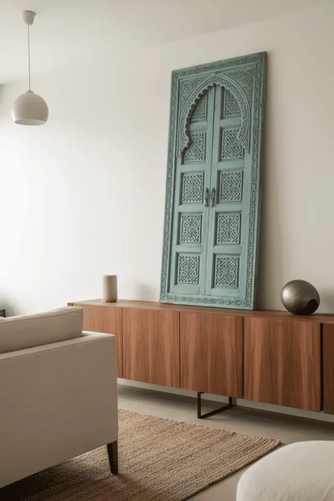 A single traditional Moroccan door — tall, intricately carved, painted in faded turquoise — mounted on the wall as sculptural art. The door leans or hangs above a low credenza in natural walnut. The rest of the room is minimal: a neutral sofa, a jute rug, simple lighting.
