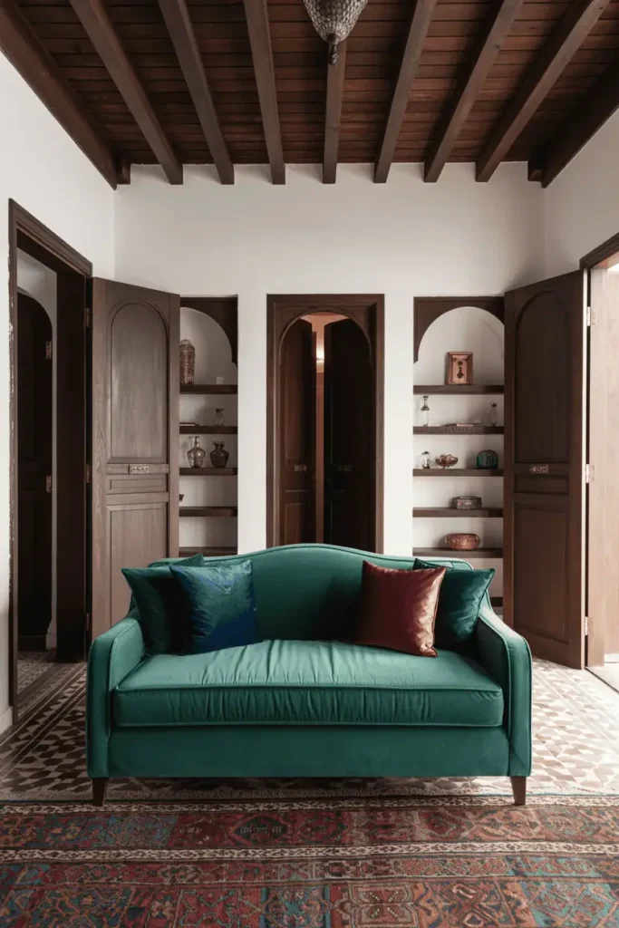 The door becomes the room’s anchor. It introduces color, craft, and history without requiring a full renovation. This approach works when you want Moroccan character but prefer a restrained overall aesthetic. It’s also practical for renters or temporary spaces.
