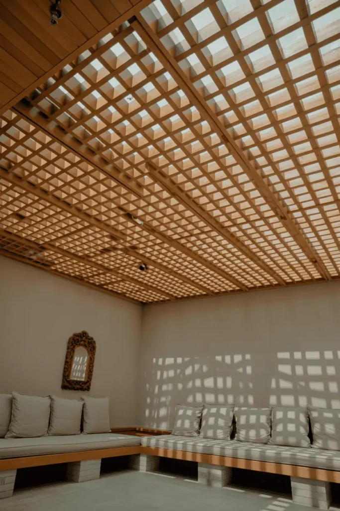 9. Lattice Wood Ceiling Panels Over Low Seating