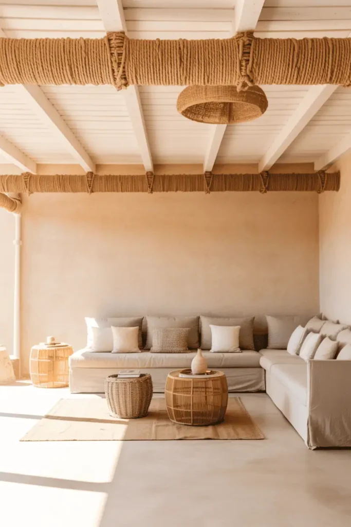 The ceiling is whitewashed cedar, with some beams left exposed and others wrapped in natural jute rope. The walls are soft ochre plaster. Furniture is pale: a linen sectional, woven rattan side tables, cotton floor cushions. The overall palette is sand, cream, and natural fiber.