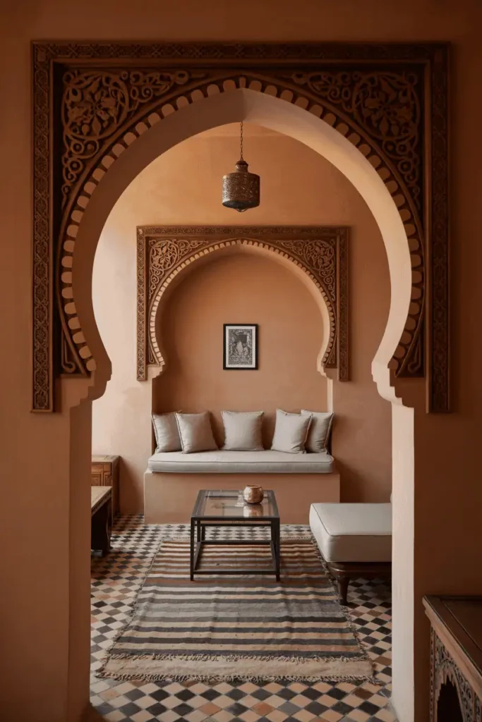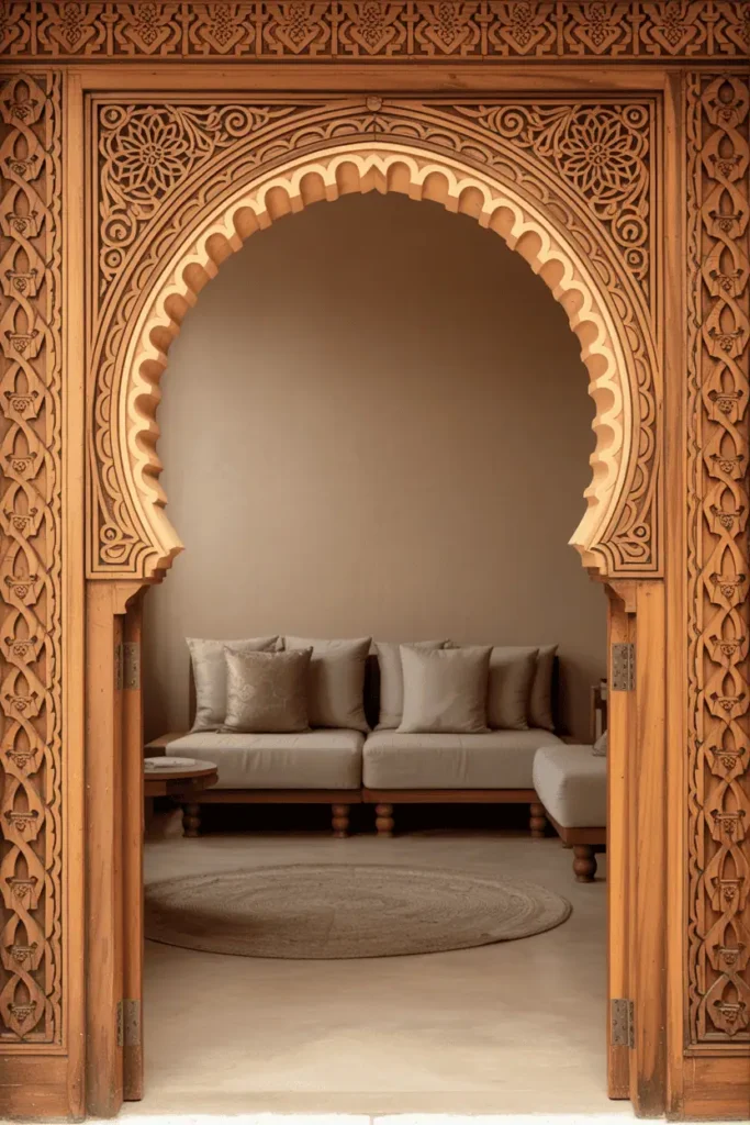 This works when you have architectural features worth highlighting. The carved frame draws the eye and establishes the room’s character before you even enter. It’s a restrained way to introduce Moroccan detail without overwhelming the interior.