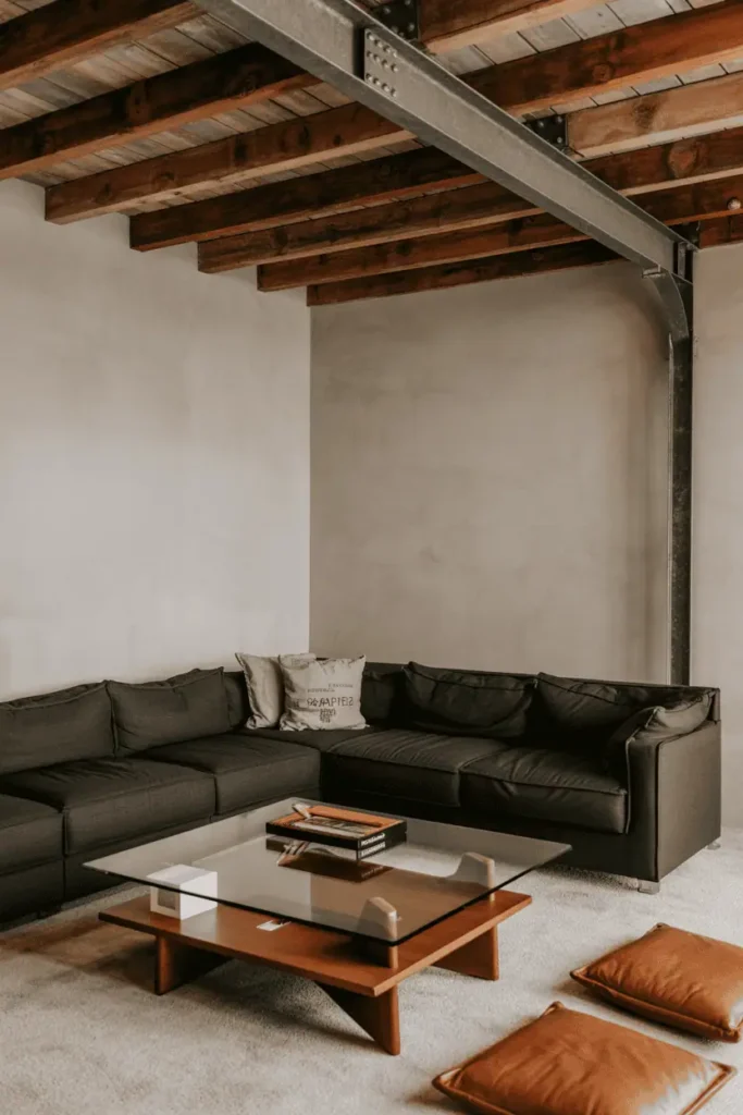 A more contemporary take. The ceiling has reclaimed wood beams — rough-hewn, varied in width — paired with exposed metal brackets and light fixtures. The walls are bare plaster. Furniture is low and modern: a charcoal sectional, a glass-topped coffee table with a wood base, leather floor cushions.