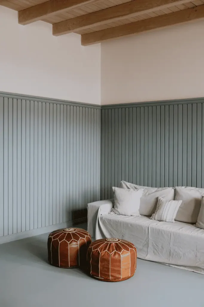 Not all Moroccan wood is bare or polished. In this room, the lower half of the walls is covered in painted wood paneling — tongue-and-groove in a soft blue-gray. The upper walls are white. The ceiling has exposed beams in natural oak. Seating is a mix of a linen sofa and woven leather poufs.