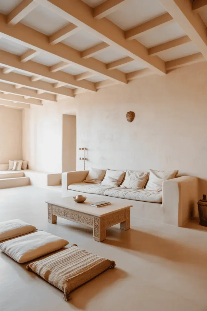 A quieter approach. The ceiling is exposed, with pale wood beams running the length of the room. The walls are white plaster, slightly textured. Furniture is minimal — a low sofa, a carved coffee table, a few floor cushions in undyed wool. The wood tones are light: beech or whitewashed cedar.