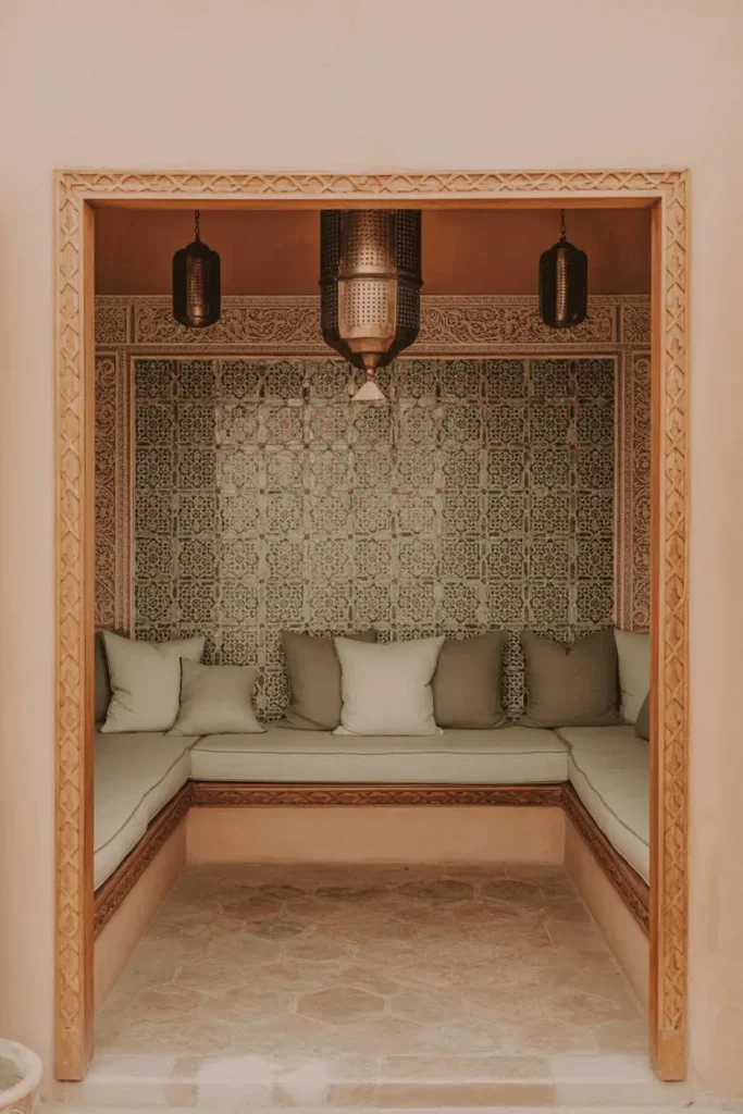 1. Zellige-Tiled Walls with Carved Cedar Seating