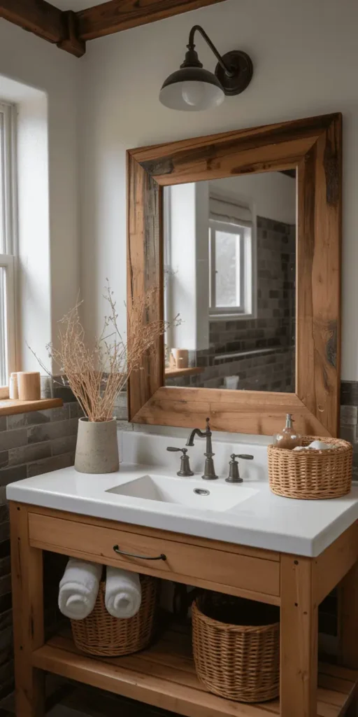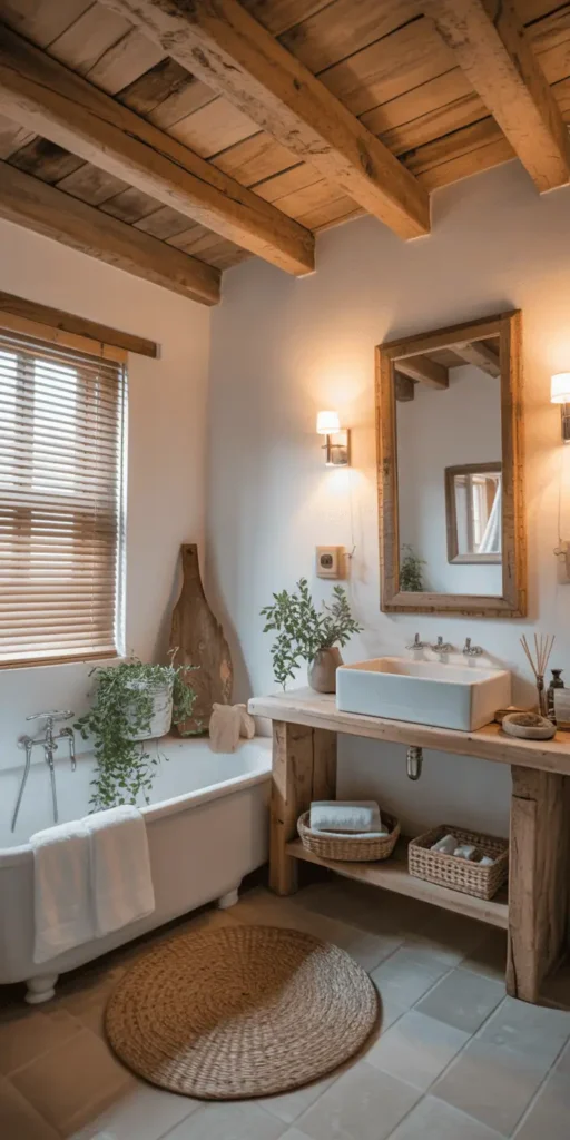 Warm woods, natural textures, and earthy tones create the perfect balance between cozy and serene. These ideas bring that weathered, lived-in charm while making your bathroom feel like a place you actually want to linger.