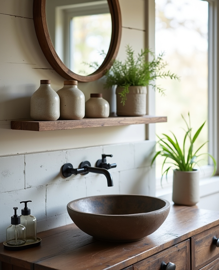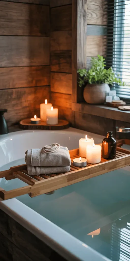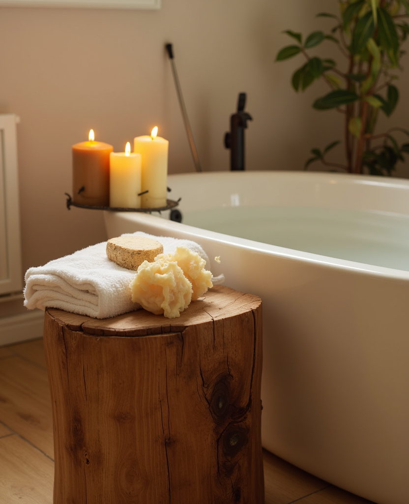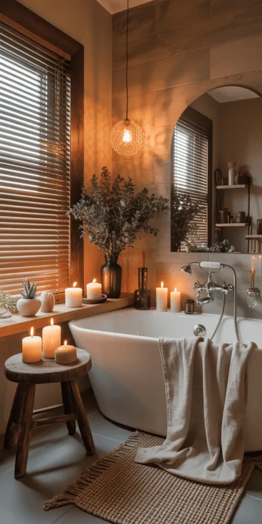 A simple wooden stool beside your tub or next to your vanity adds rustic charm and serious functionality. Use it to hold a candle, a stack of washcloths, or a small plant.