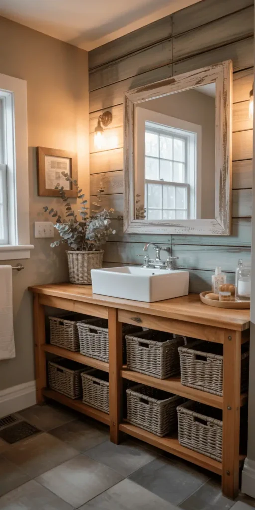 Open shelving underneath keeps things airy and lets you display rolled towels, woven baskets, or a pretty tray of bath essentials. It’s rustic without feeling cluttered.
