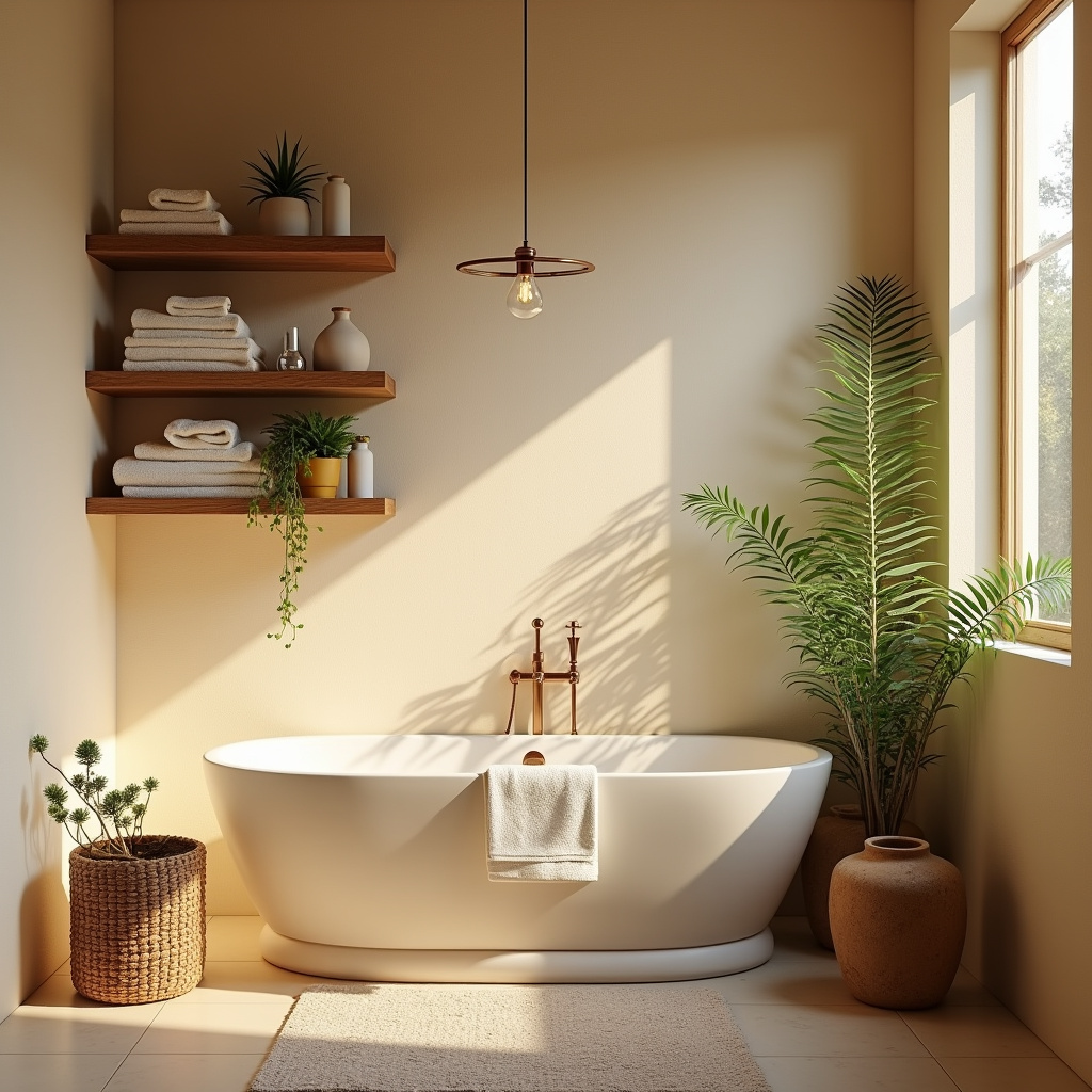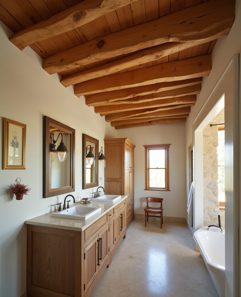 If you really want to commit to the rustic spa vibe, add exposed wood beams to your ceiling. Cedar or pine beams bring architectural interest and a cozy, cabin-like warmth.
