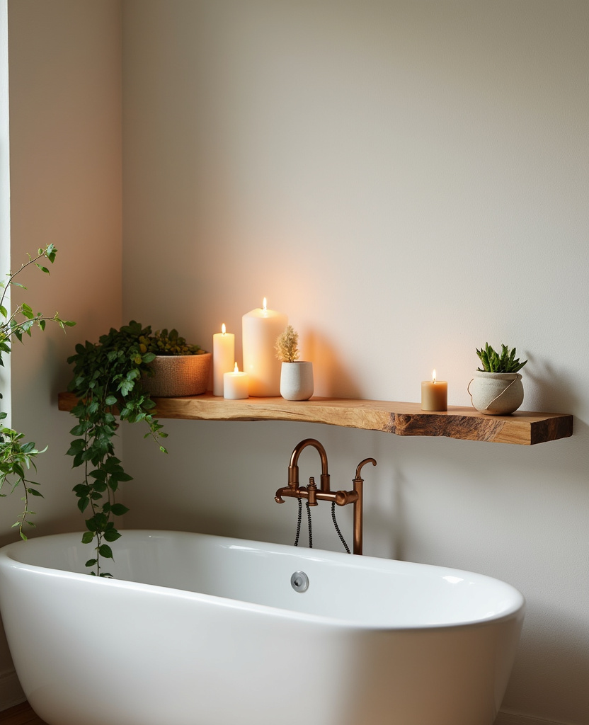 A live-edge shelf — with the natural bark edge still intact — adds organic beauty and rustic elegance. Mount it above your tub to hold candles, eucalyptus bundles, or a few favorite bath products.