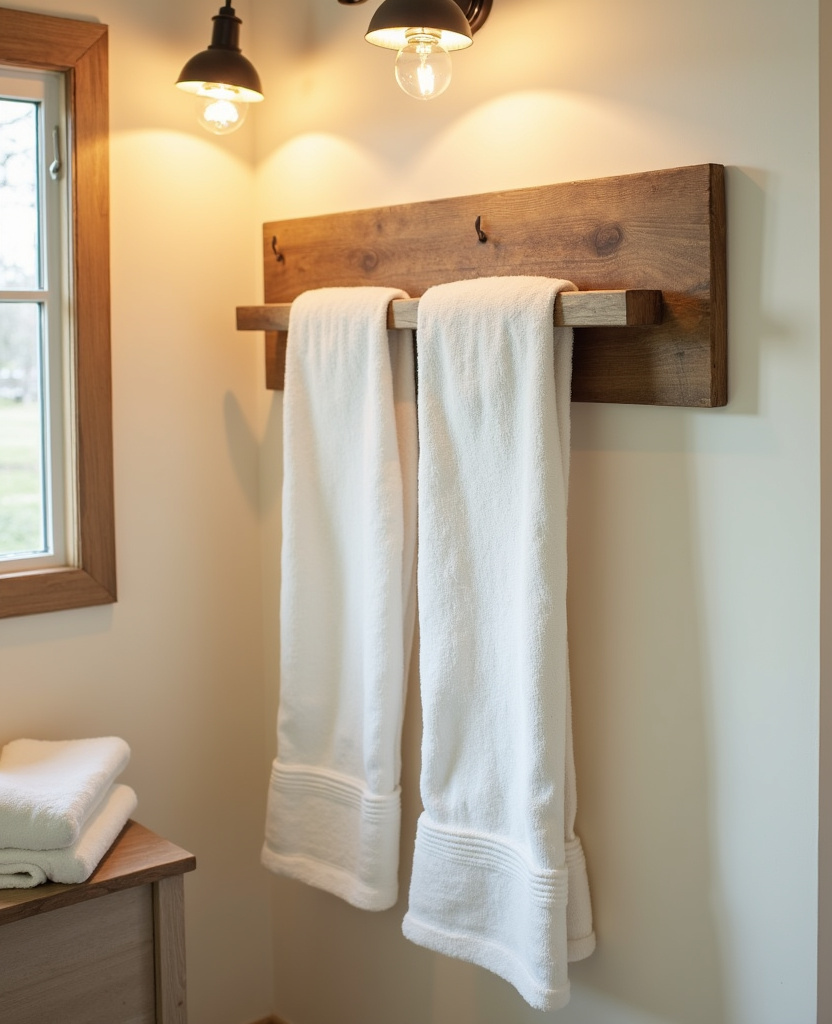 Ditch the chrome towel bar and go for wooden hooks or a rustic wood rack instead. Hooks made from natural branches, reclaimed wood, or chunky dowels add farmhouse charm while keeping your towels accessible.