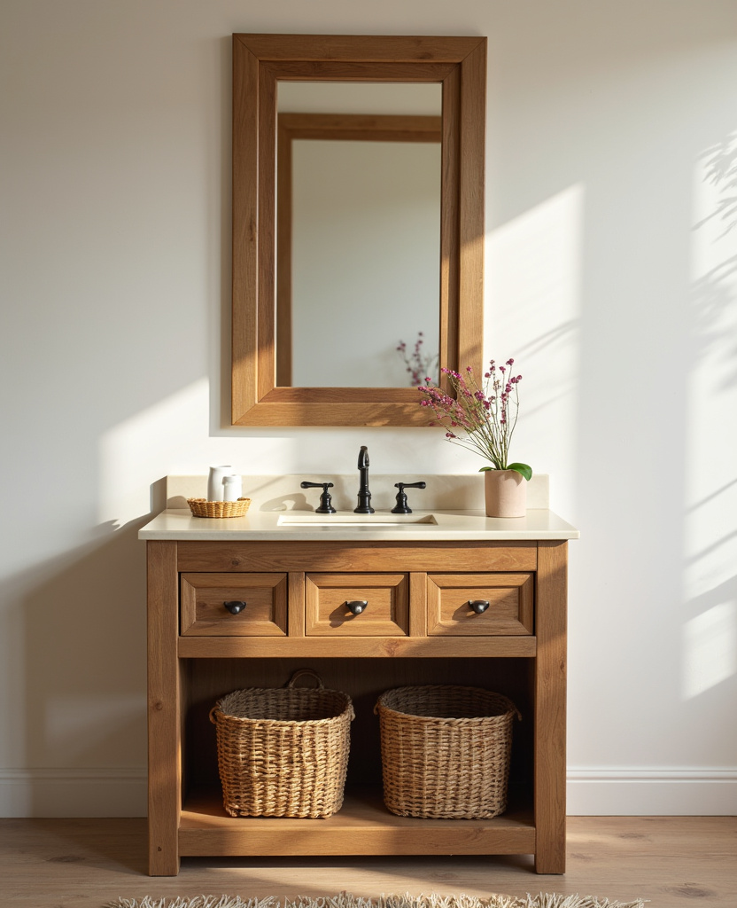 Swap out that builder-grade cabinet for an open wood vanity, and suddenly your bathroom feels like a boutique spa. Natural wood tones — think walnut, oak, or cedar — bring earthy warmth that grounds the space.