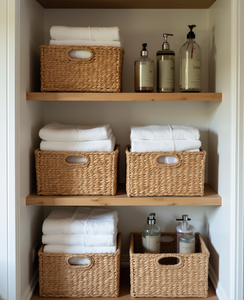 - 7 7. Woven Baskets on Wood Shelves