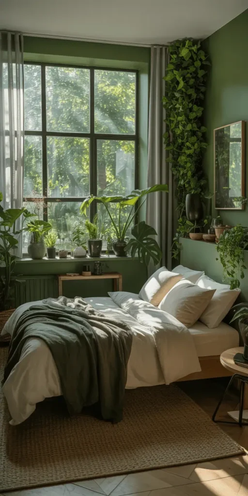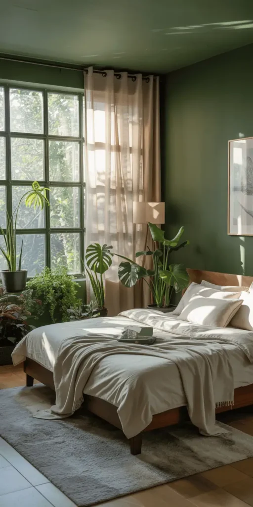Bringing nature indoors makes a dark green bedroom come alive. Earthy bedroom design shines with lush plants, creating a space that’s both stylish and healthy.