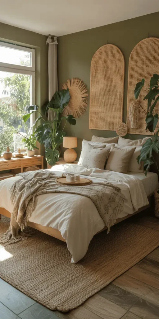 Enhance your earthy bedroom design with textures like reclaimed wood headboards. Add river stone accents or woven rattan baskets. Botanical wall art or linen textiles bring nature’s colors into your room.