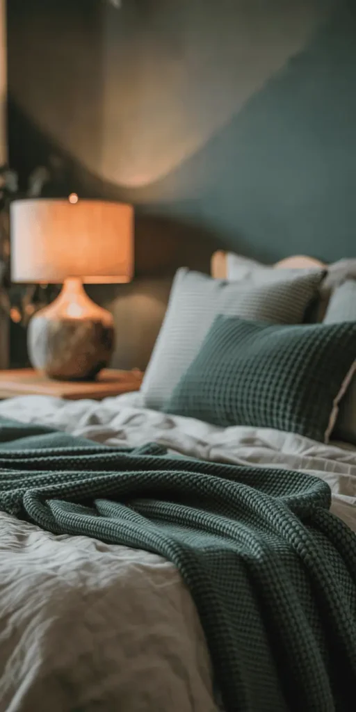 For cozy green bedroom bedding, choose soft linens in ivory or muted grays to contrast with deep greens. Velvet throw blankets or textured pillows add depth. Try geometric patterns in soft colors.