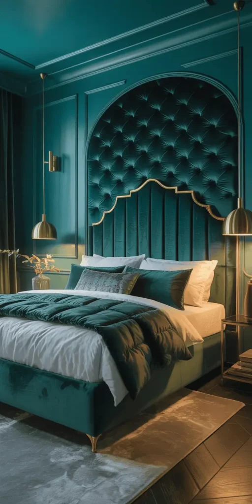 Soft textures like velvet soften dark green’s boldness. Velvet headboards in charcoal or cream add depth. Linen upholstery brings natural warmth.
