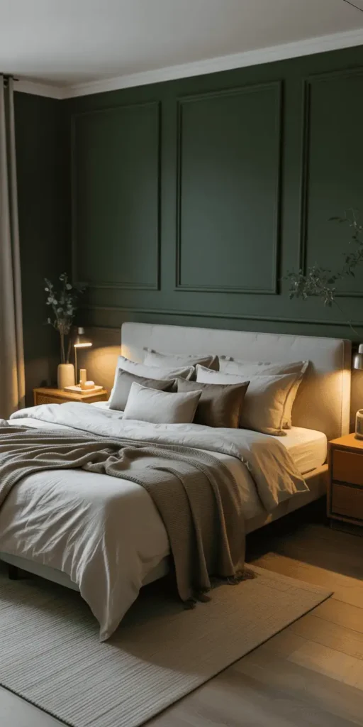 A cozy green bedroom balances closeness and space. Dark green’s richness warms up big rooms. In smaller ones, it prevents feeling trapped. Pair it with soft textures like velvet or linen for extra warmth.