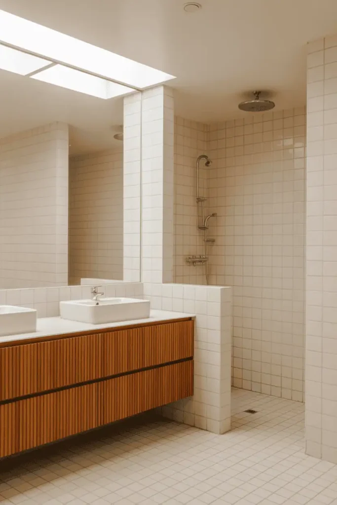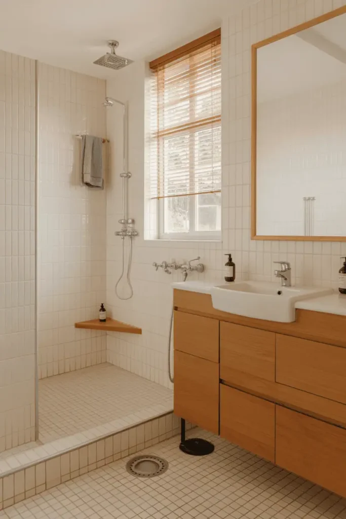 Light tile and warm wood are natural partners. Tile keeps the space clean and bright, while wood adds contrast and texture.